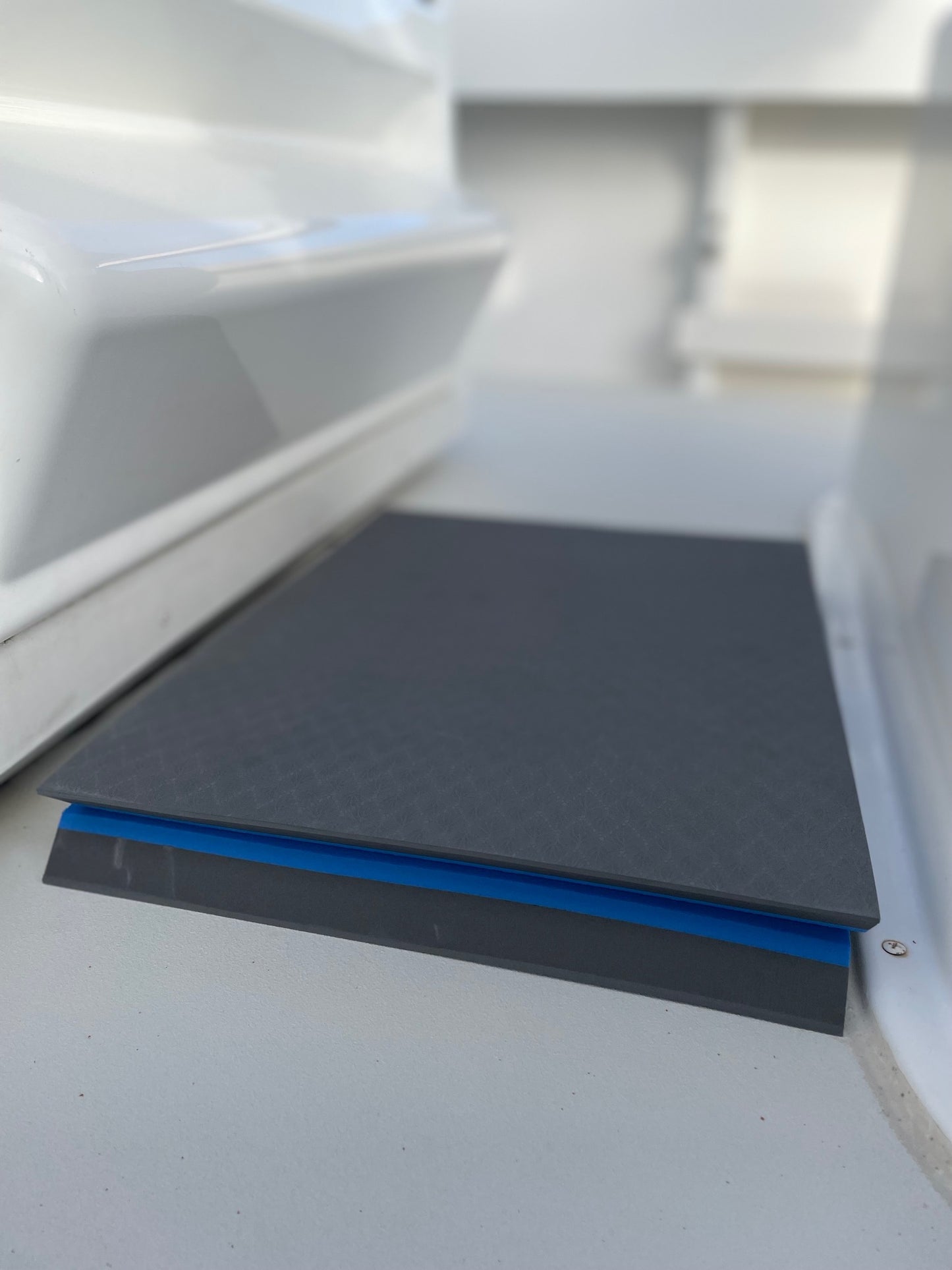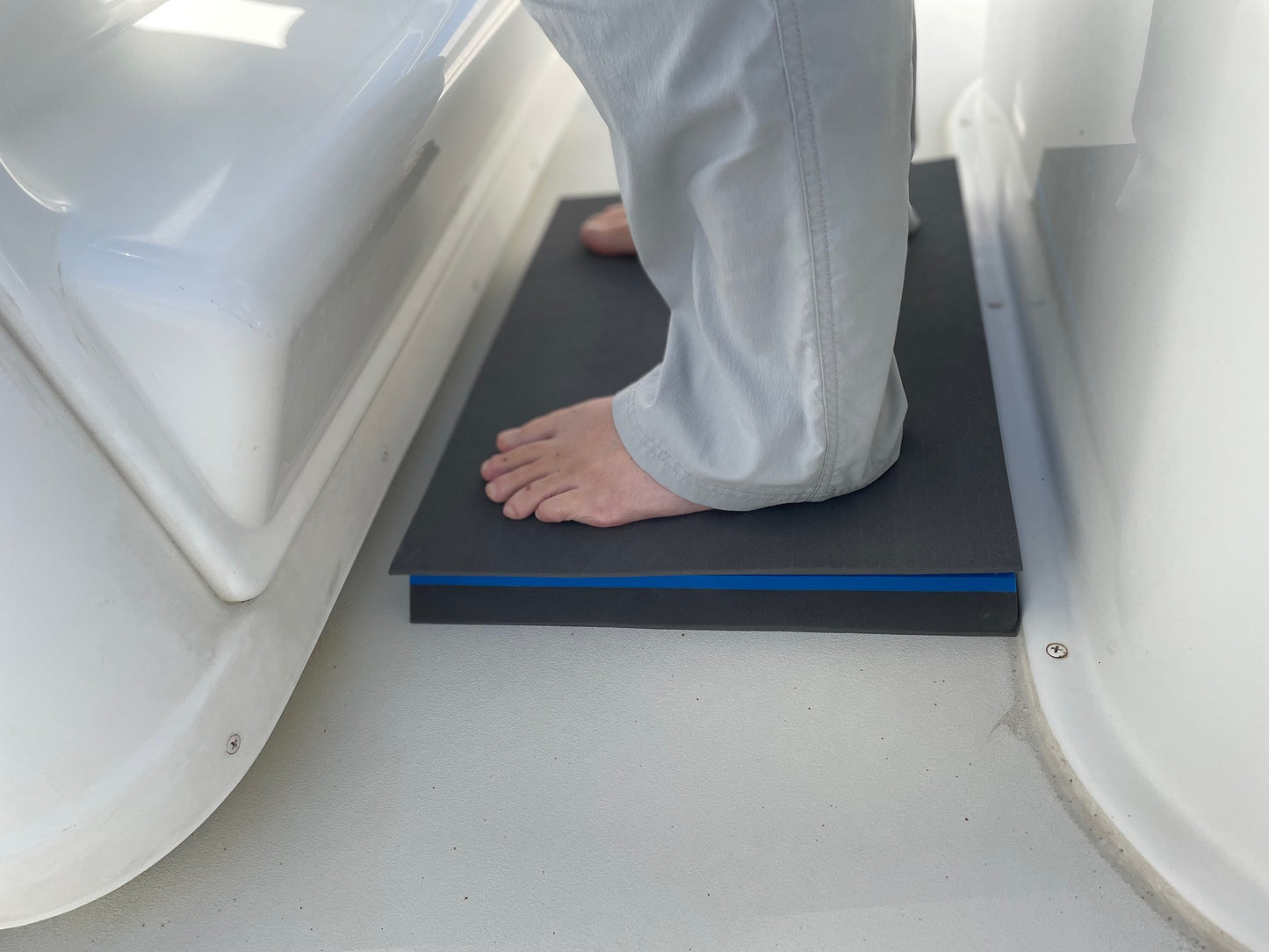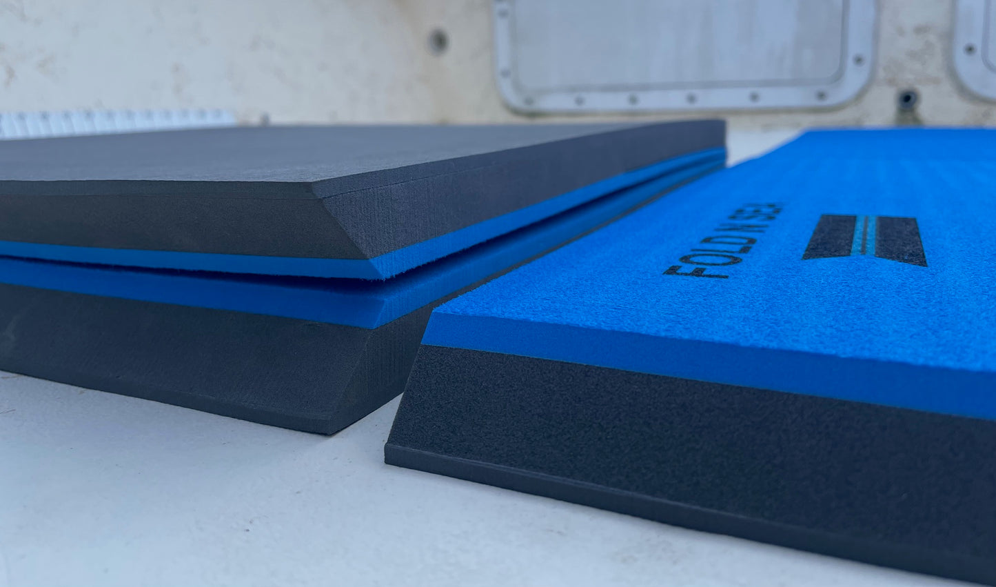 Designed to reduce the pounding in rough boating conditions or during long bouts of standing at the helm. Made of 1" thick (25mm) sponge rubber for ultra-comfort. The patented unique design allows the mat to fold over on itself. The folded mat becomes 2" thick, allowing the vessel operator to see over the console, grab rail, wind shield, or t-top brackets.